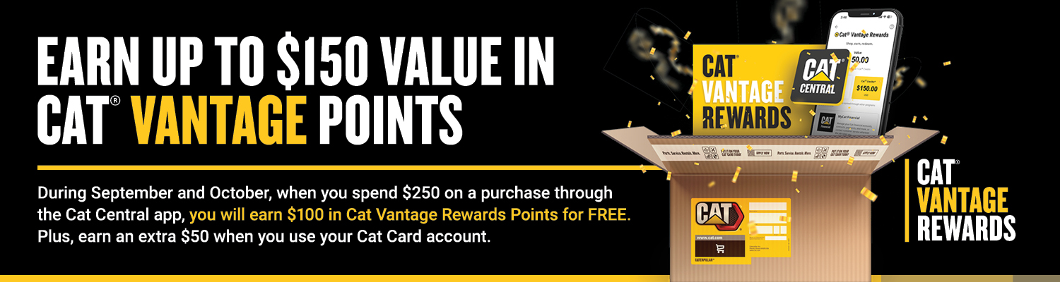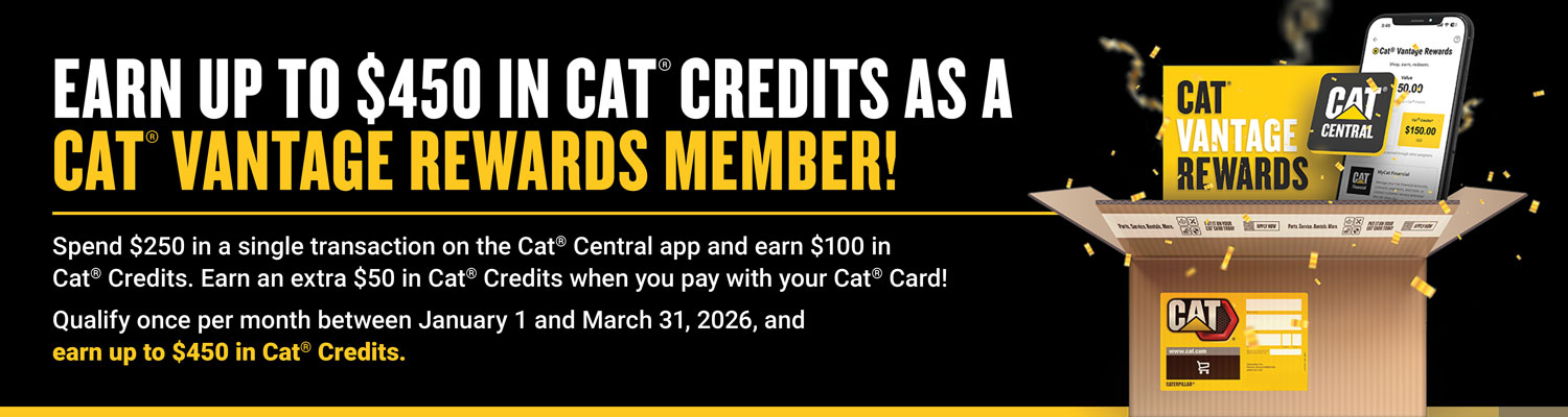 Cat® Vantage Rewards is your way into exclusive new opportunities to earn — and earn more. Now when you shop for Cat products on parts.cat.com or the Cat Central app, you can earn reward points from anywhere, manage them easily online, and redeem Cat Credits from your balance. Plus, earn even more on all qualifying purchases you make with your Cat Card Account.