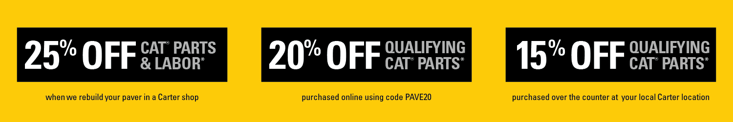 Now through March 31, you’ll get 25% off Cat parts and labor* when you commit to a complete in-shop rebuild. Only need a tune-up? Enjoy 20% off qualifying Cat parts online using promo code PAVE20 or take 15% off purchases made at your local parts counter.